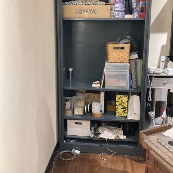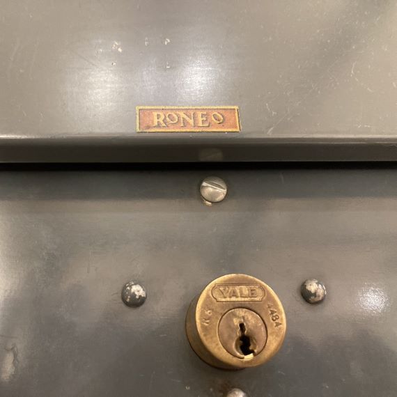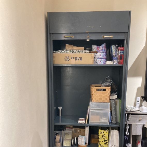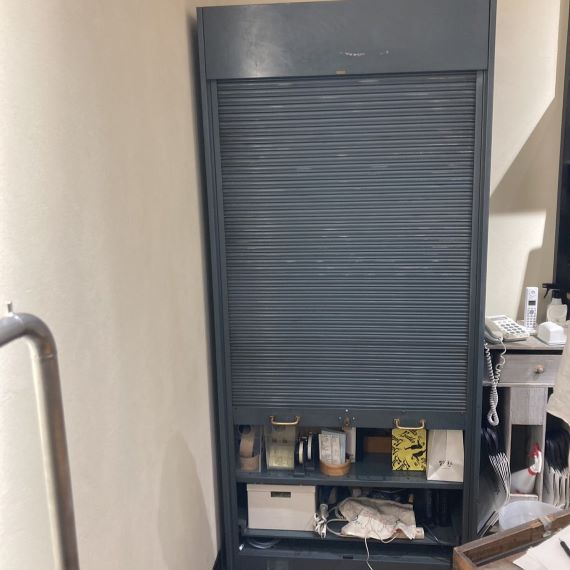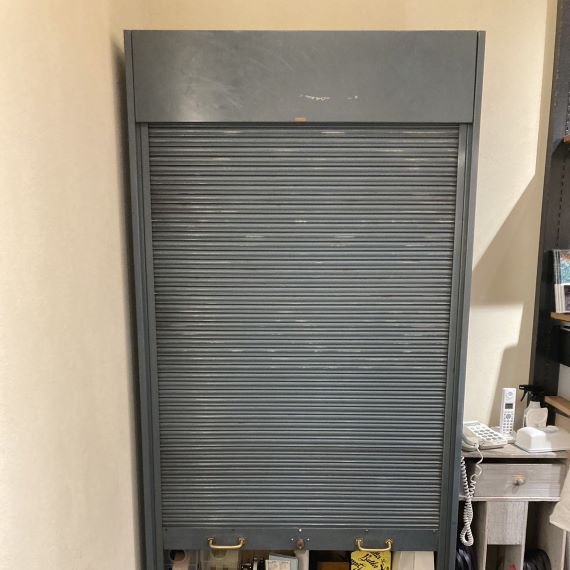 ヴィンテージのスチール製ファイルキャビネット。シャッター型の扉ですので、扉の可動域のスペースを確保する必要がなく、全開するので、出し入れがしやすく、便利です。