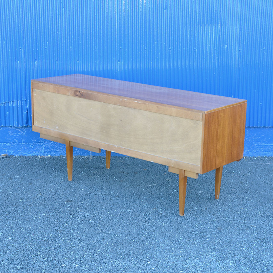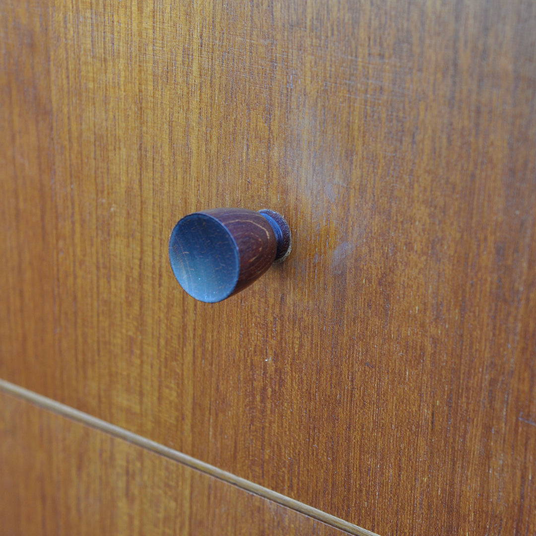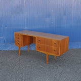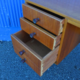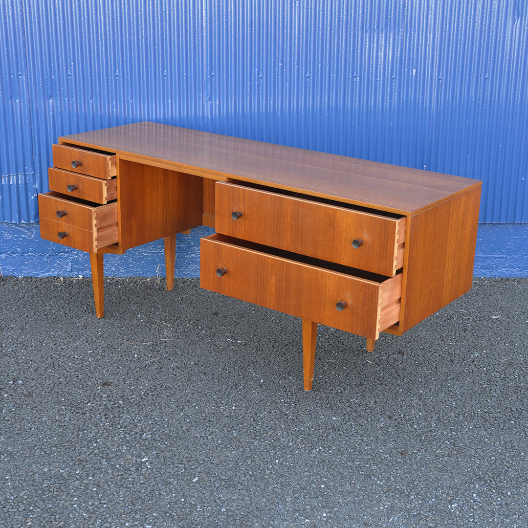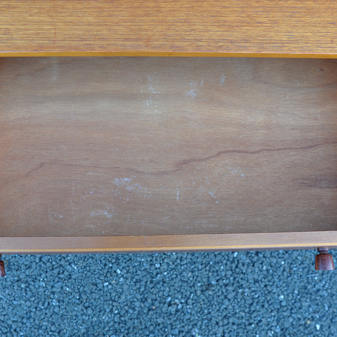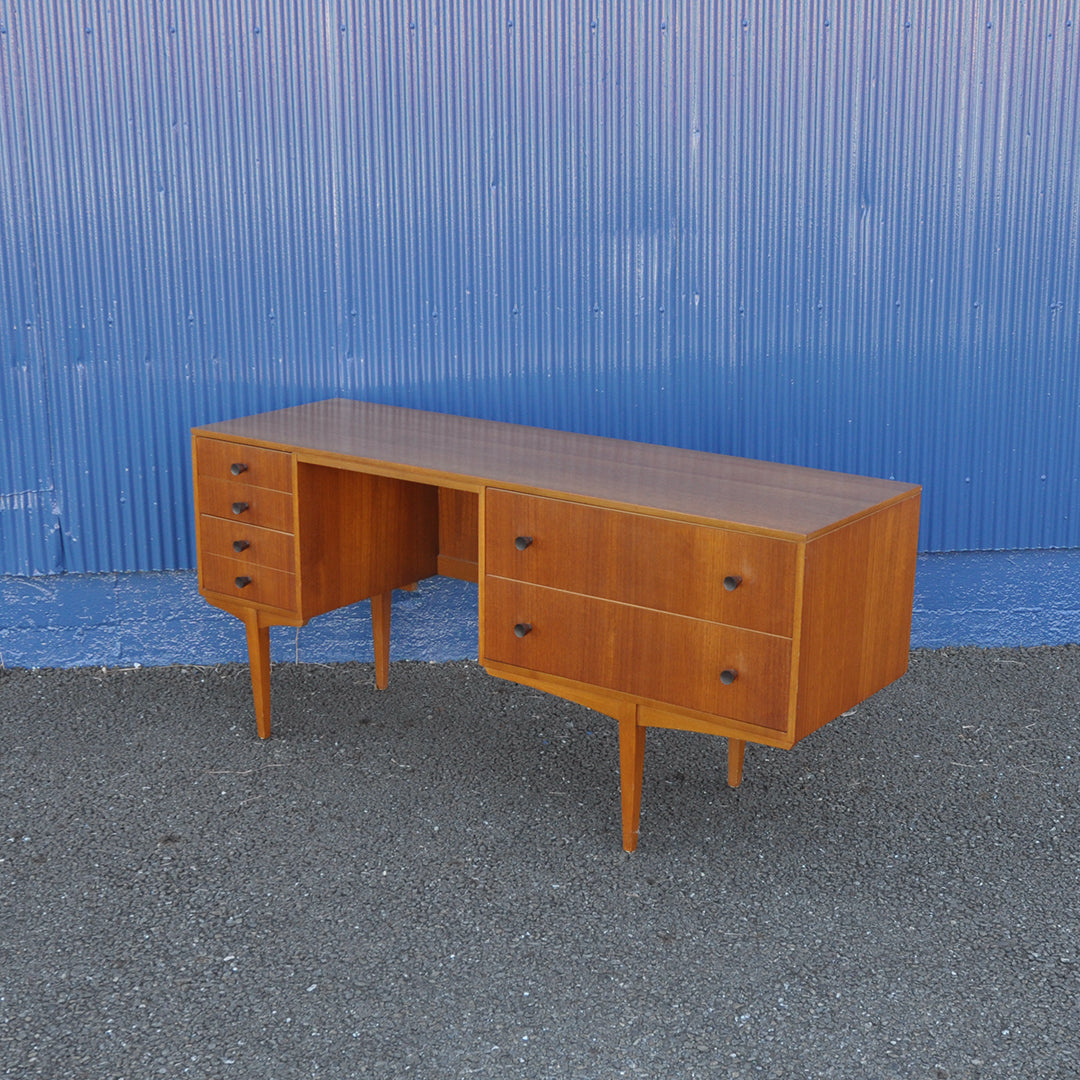 ワイド方向に強調されたデザインが特徴の、とてもシンプルなチークデスク。左袖の引き出しは、取っ手が4個ありますが下2段はダミーで、深い引き出しが1杯になっています(浅い引き出し x 2杯、深い引き出し x 1杯)。オイルフィニッシュで仕上げられたナチュラルな風合いは使う場所を選びません。コンソールデスクや、ミラーを置いてドレッサーにしても。