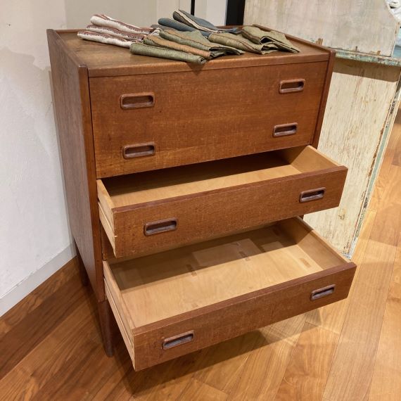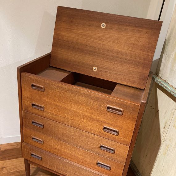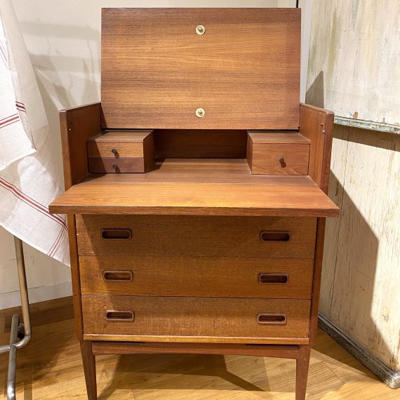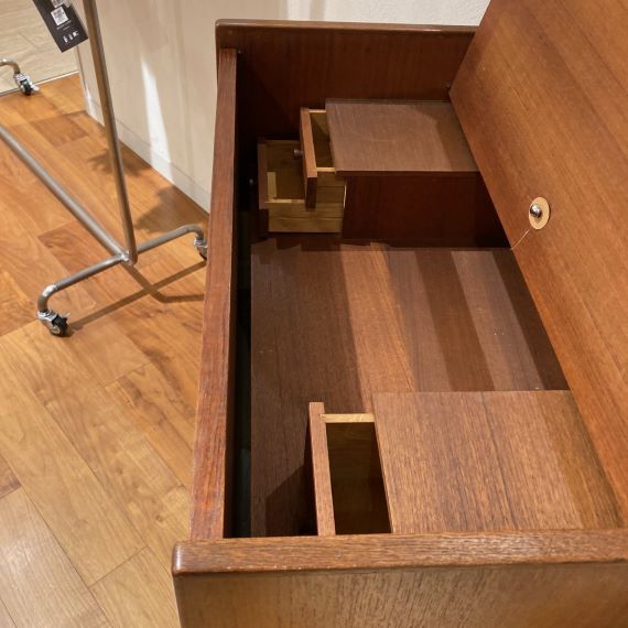 天板を開けるとドレッサーになるチークチェスト(ミラーは付いていません)。上段の引き出しはダミー(=本物の見掛けをしたもの)になります。