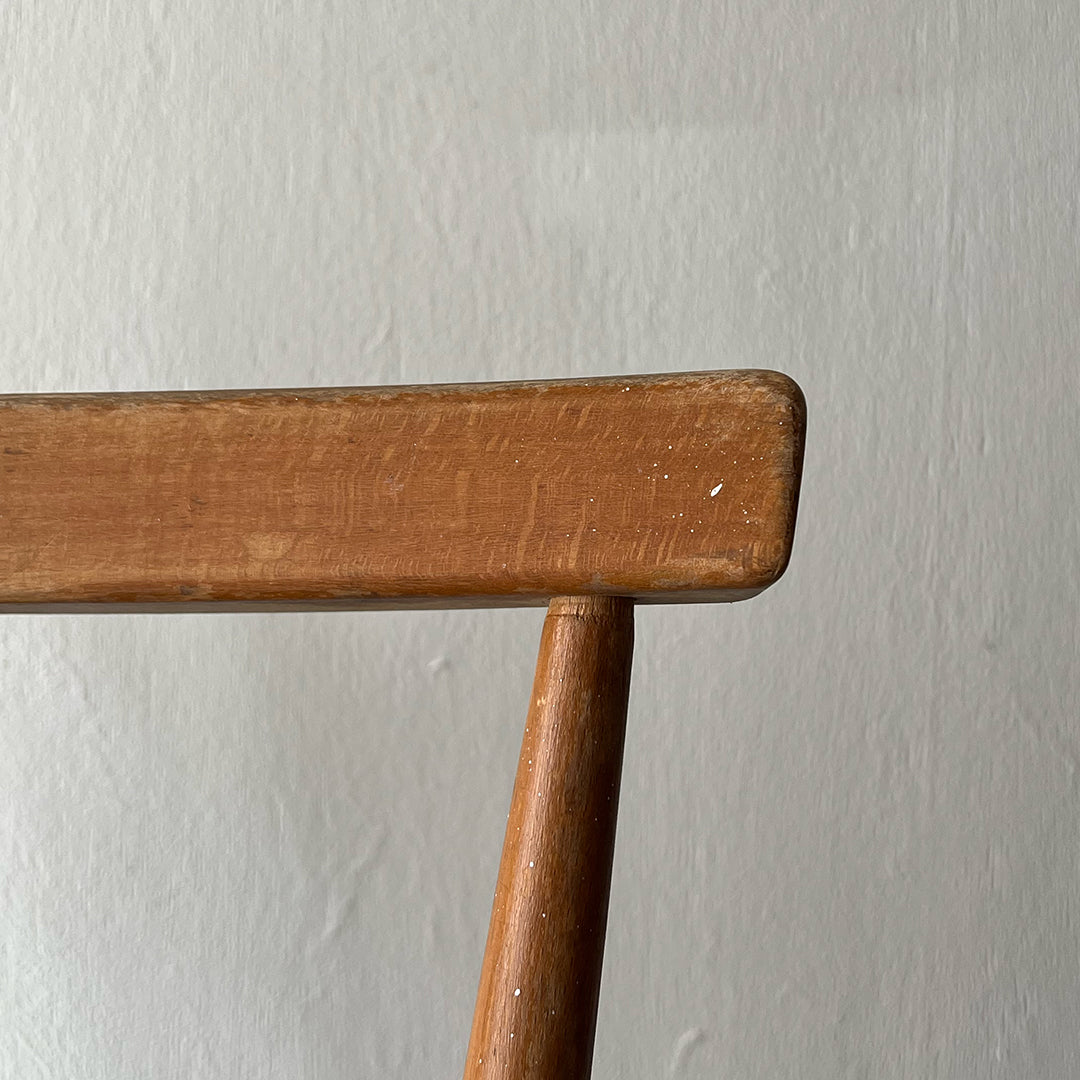 座面はニレ材、他の部材はブナ材を使用。スピンドルが後脚のつなぎに接合されたデザインが秀逸です。今回はディスプレイとしてのご紹介で、経年変化によるがたつきや割れのある現状のままでのお渡しです。