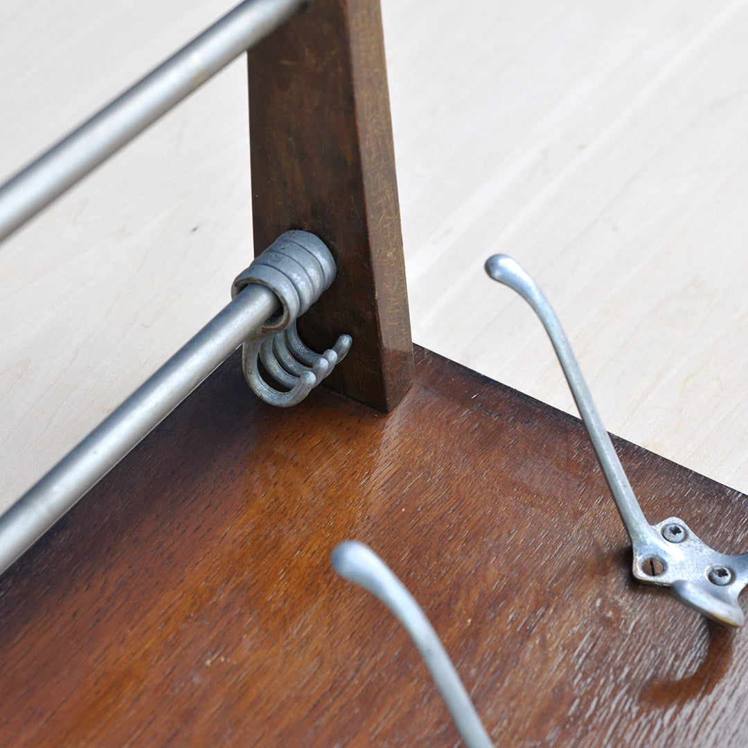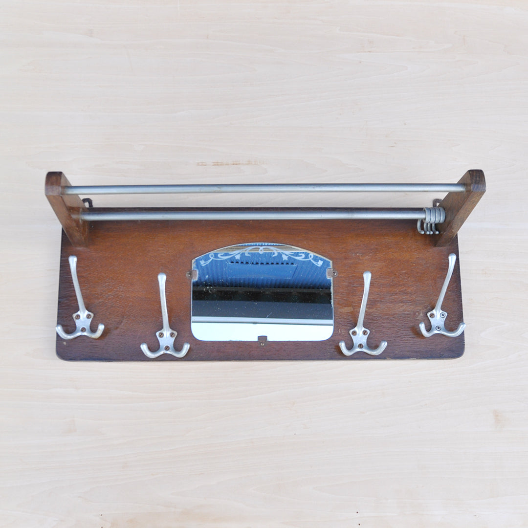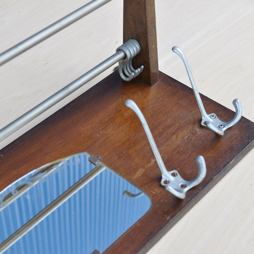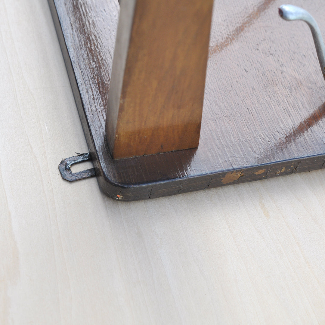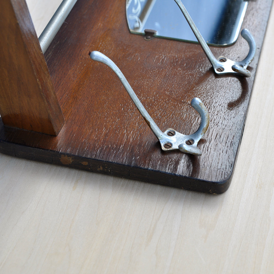 可動式のフックが棚のポールに付いたアンティークミラーコートラック。フックにミラーにシェルフに、と機能が凝縮された一品です。