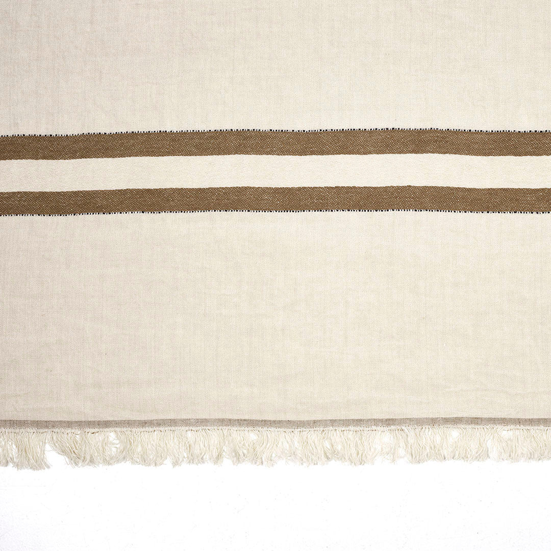 さらっとしたリネンの風合い豊かなLIBECOのスローベルジャン「レイルウェイ」。織で施されたナチュラルなブラウンカラーのストライプ柄が特徴です。流行に左右されずに使える一枚です。