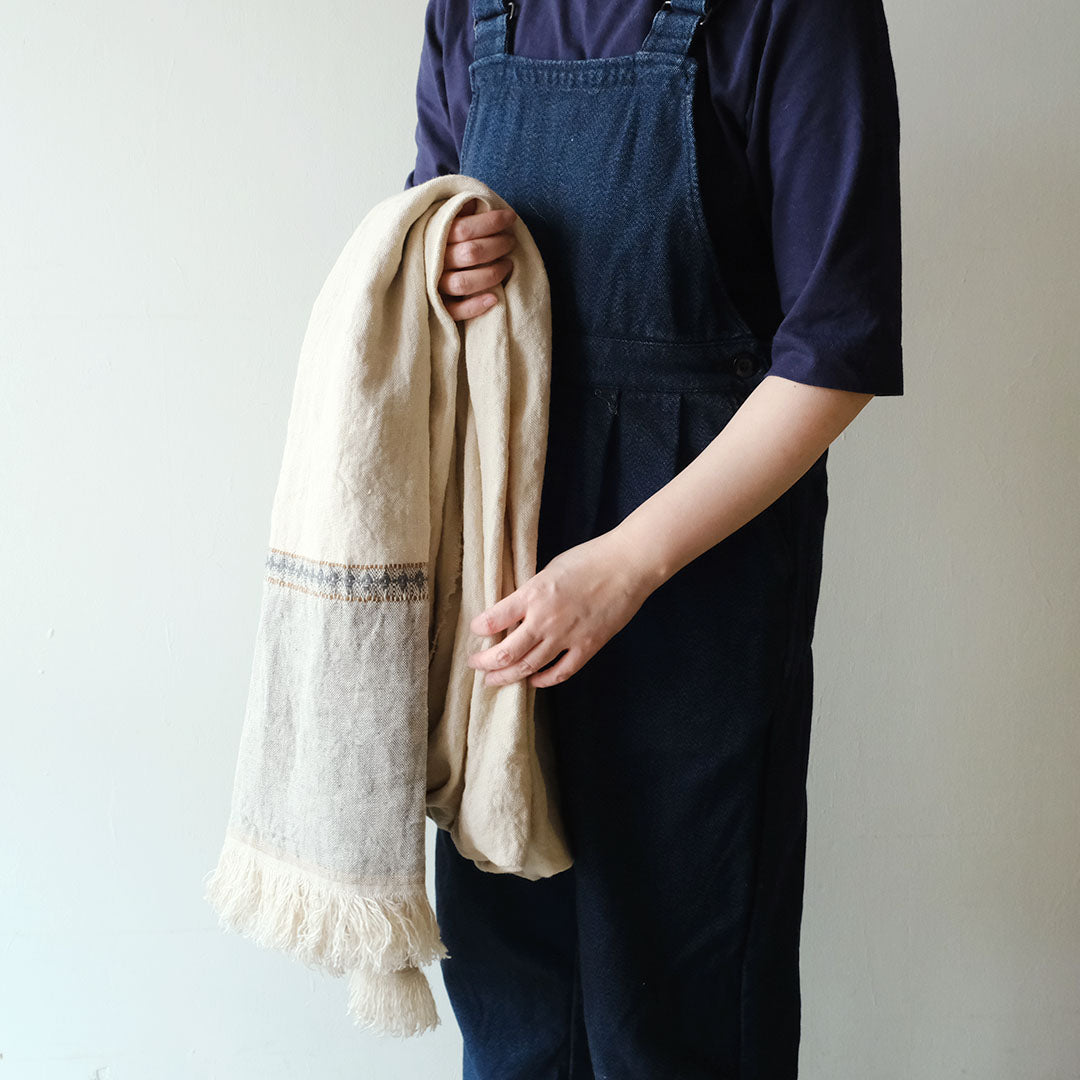 さらっとしたリネンの風合い豊かなLIBECOのスローベルジャン・イウリダ。織で施されたダイヤ柄の模様と爽やかなカラーリングが魅力です。