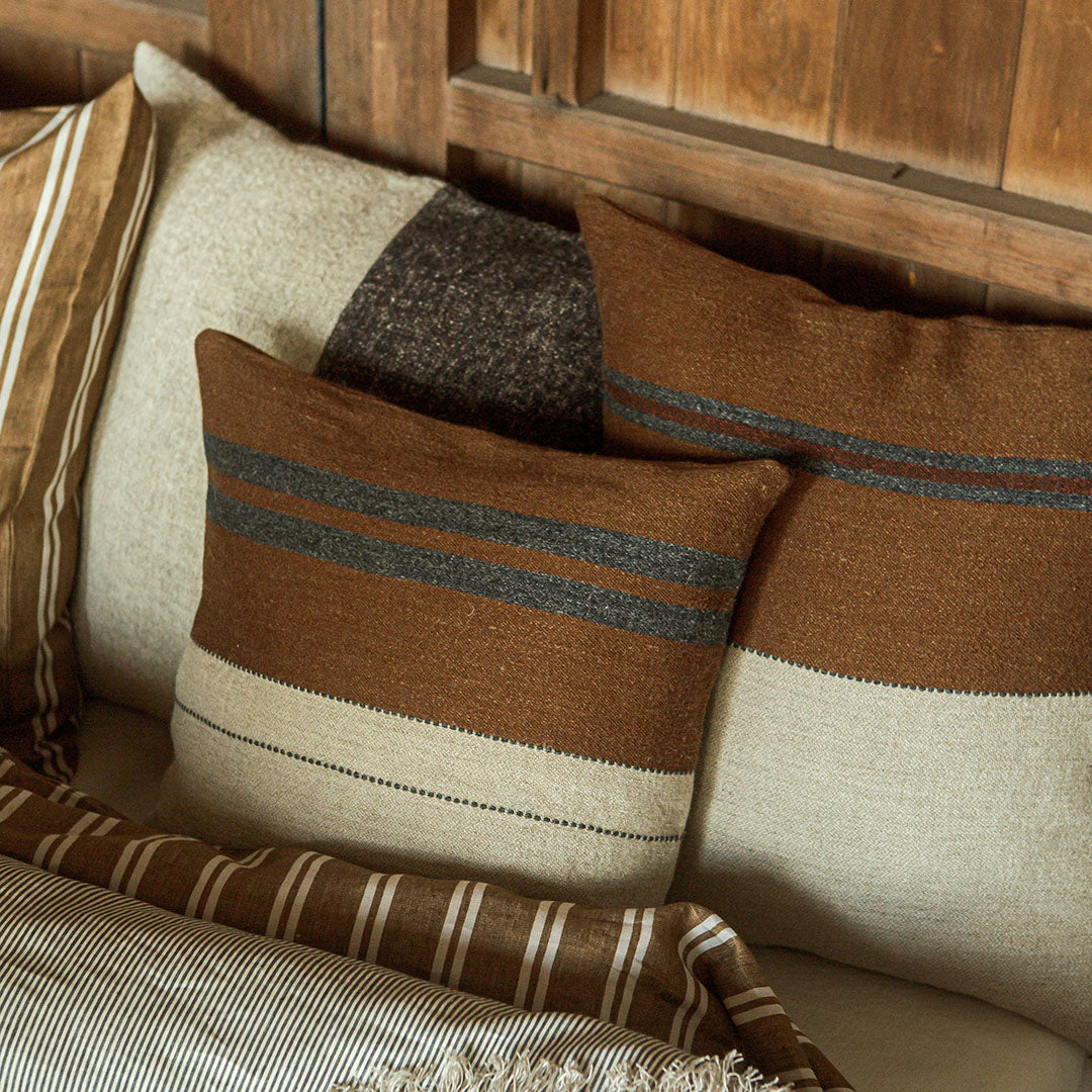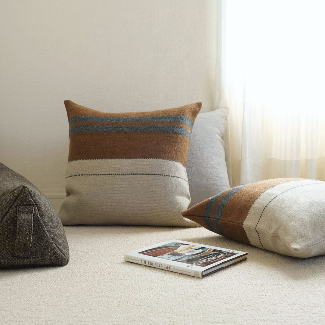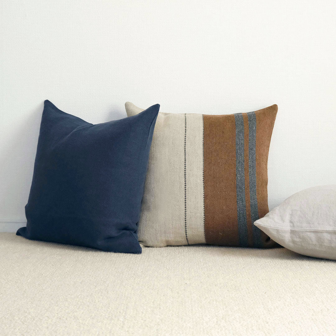 カラーリングがモダンなLIBECOのクッションカバー「ハイランド」。ナチュラルなリネンウールの風合いが特徴で、縦横の配置の仕方で印象の異なるマルチストライプが楽しめる一枚。優しい肌触りのクッションとリラックスした時間をお過ごしください。