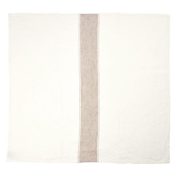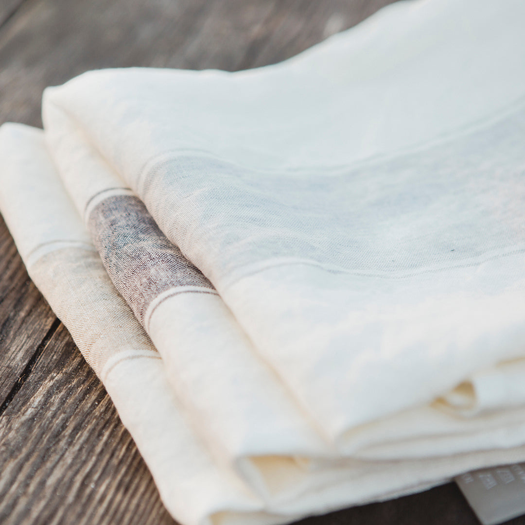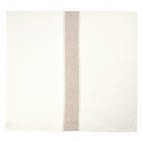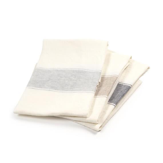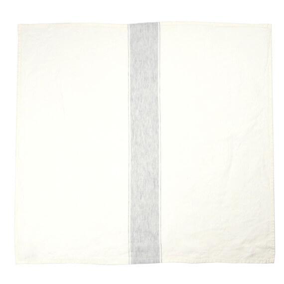 ホワイトにアッシュカラーのラインが入ったキッチンタオル「アジャクシオ」。使うほどに柔らかくなるリネン100%のキッチンタオルは、拭いたり、掛けたり、敷いたり、包んだりと用途はさまざま。贈りものにも喜ばれますよ。