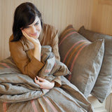 グレイッシュなブラウンに赤いピンストライプがアクセントになった、デュベカバー「ノッティングヒル」。デュベカバーの入れ口はビンの口のような形状をしたボトルネックで、マットレスに巻き込んだり、カバーの内側に折り込んで使用します。同シリーズにピローケースがあります。
