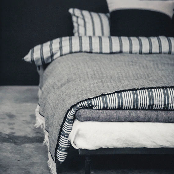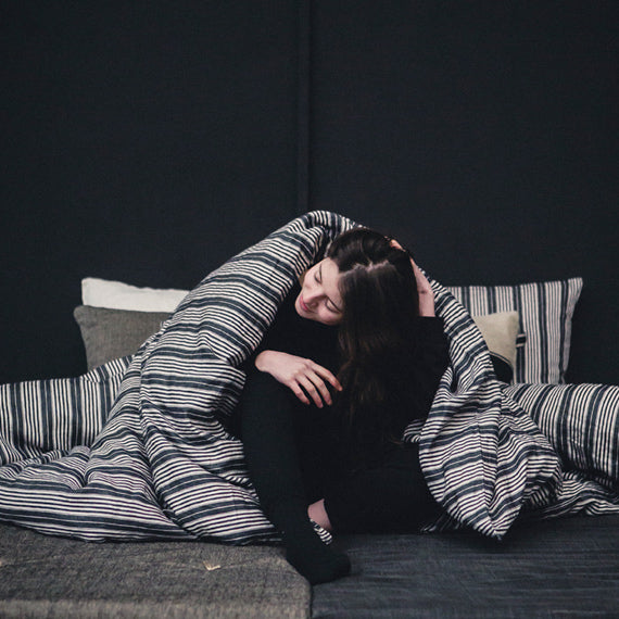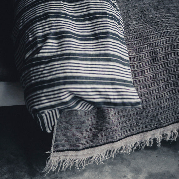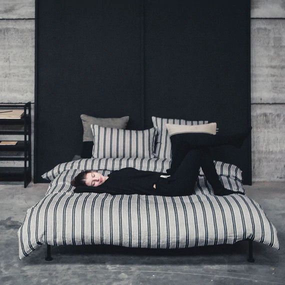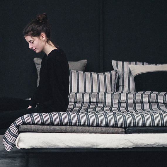 シャープ な印象のデュベカバー・タックストライプ。ブラックをベースにアイボリーのマルチストライプが特徴です。ほどよい厚さの綾織に、洗い加工をかけた柔らかな風合いの生地。デュベカバーの入れ口はビンの口のような形状をしたボトルネックで、マットレスに巻き込んだり、カバーの内側に折り込んで使用します。