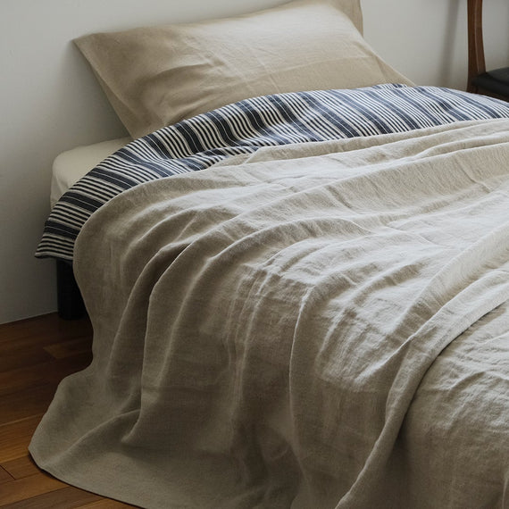 リネンは眠っている間の汗を吸収して放出し、蒸れずに繊維の中で温度を保つ力を持った天然素材。寒い時は布団に一枚重ねることであたたかく、暑い時は肌がけやシーツとして涼しく眠れて万能です。
