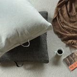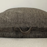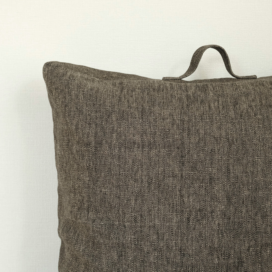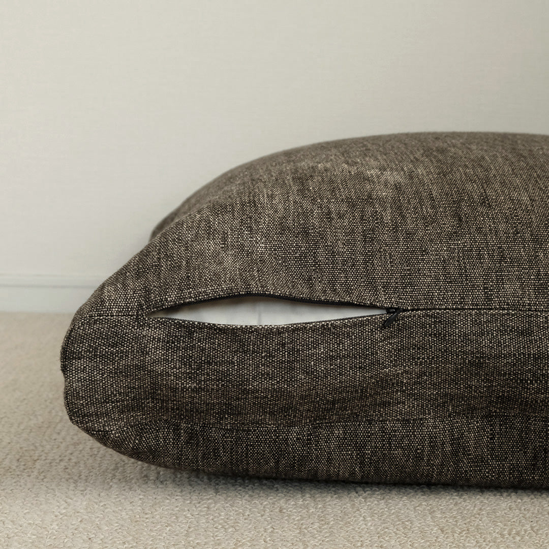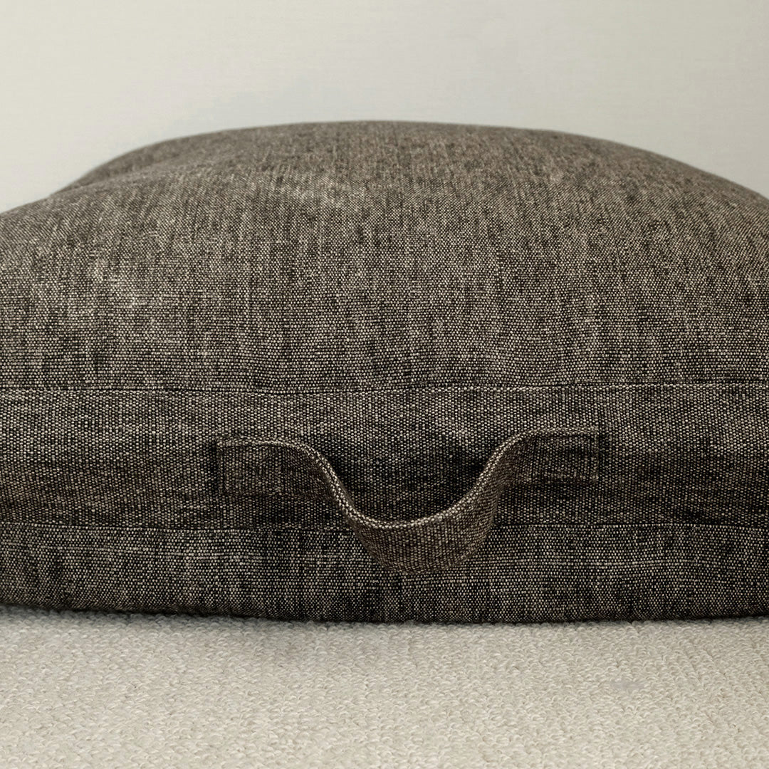 LIBECOのリネンでカバーを仕立てたフロアクッション。ざっくりとした極厚地のフラックスとダークブラウンのリネンシャンブレーでつくりました。