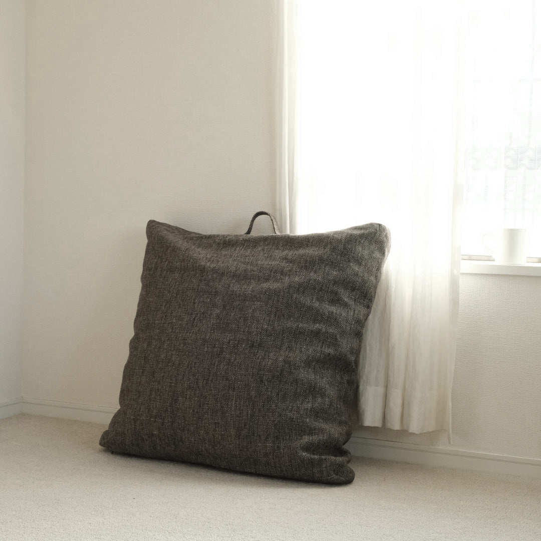 好きな場所に気軽に持ち運べるよう、小さなハンドルが付いています。大きくゆったりとした座り心地が魅力で、いつもそばに置いておきたくなるふかふかのクッションです。カバー単体でも購入できるので、色違いで模様替えや洗い替え用にも。