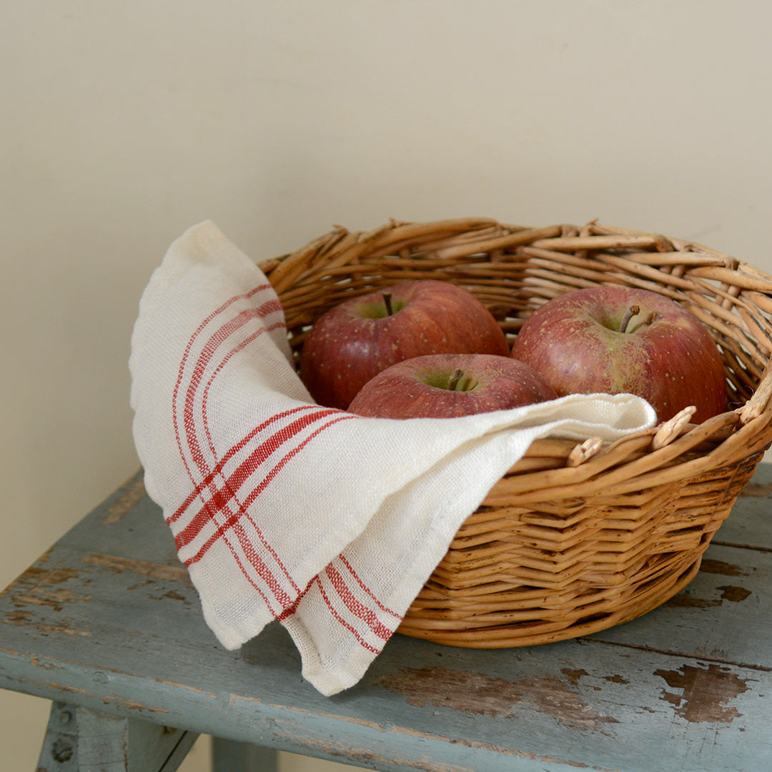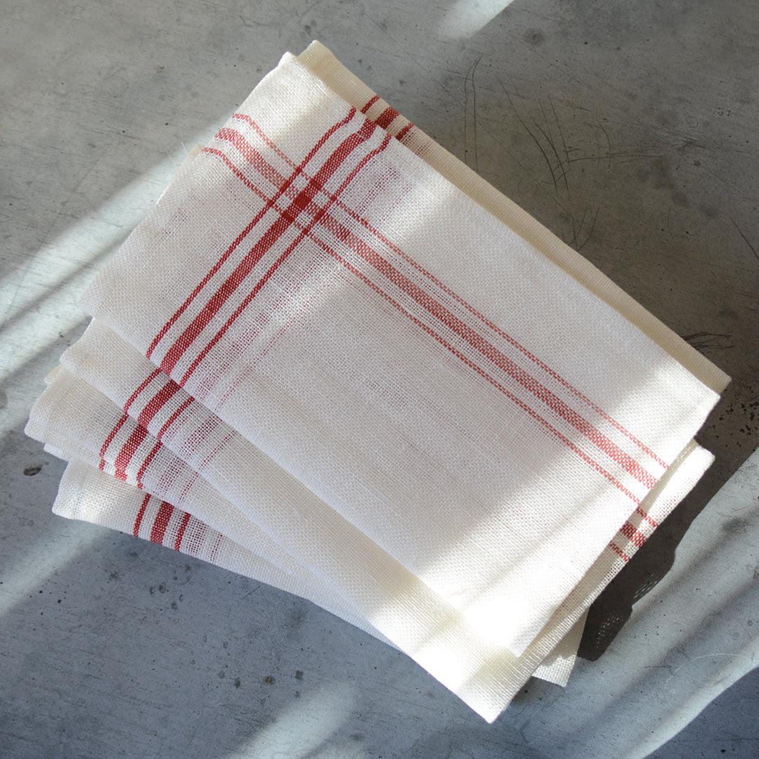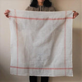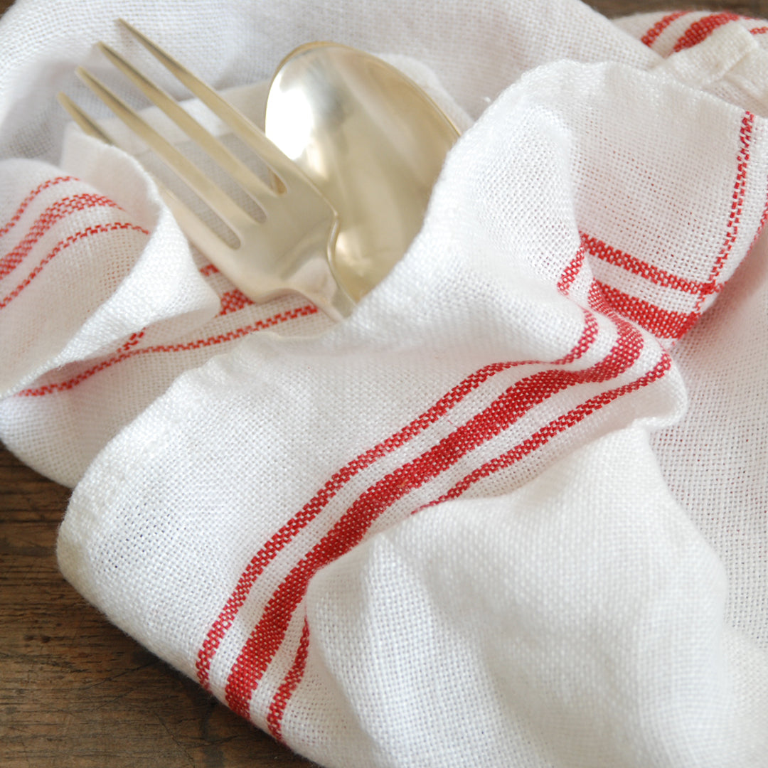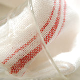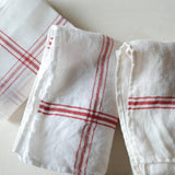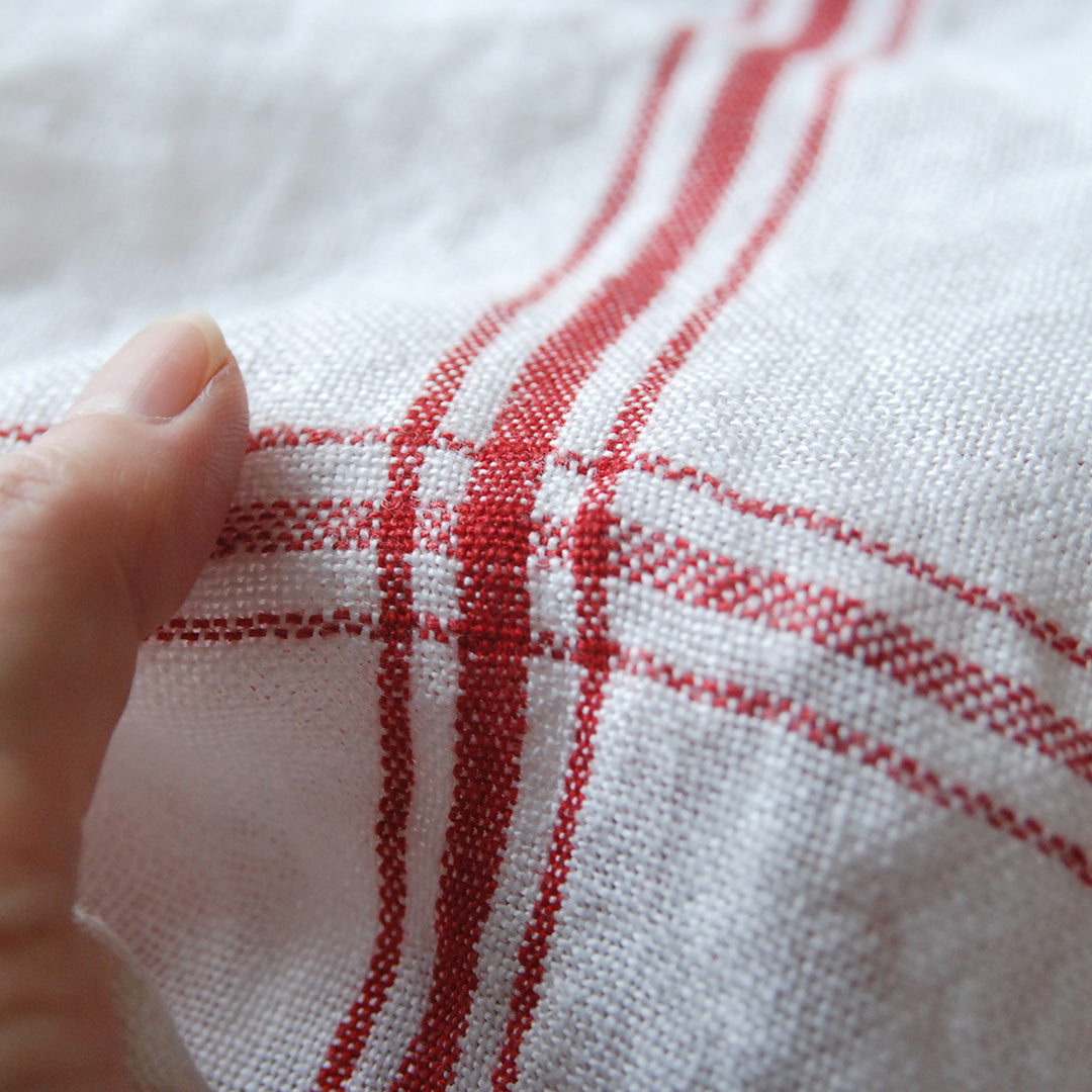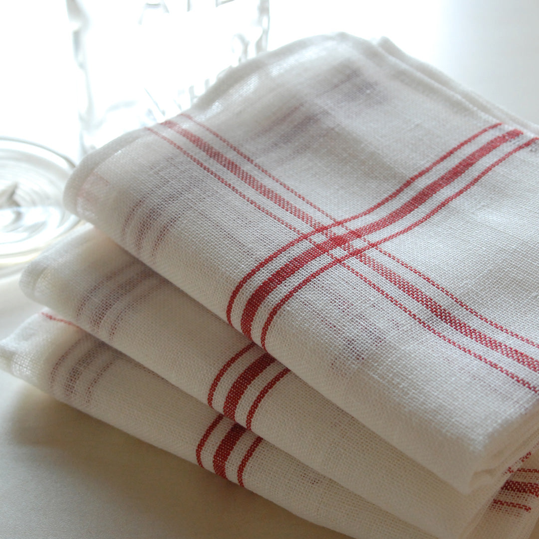 清潔感のあるホワイト地に、赤いラインが可愛らしいコンフィチュール。食器を拭いたり、テーブルに敷いたり、お弁当や荷物を包んだり、たっぷりと使えます。