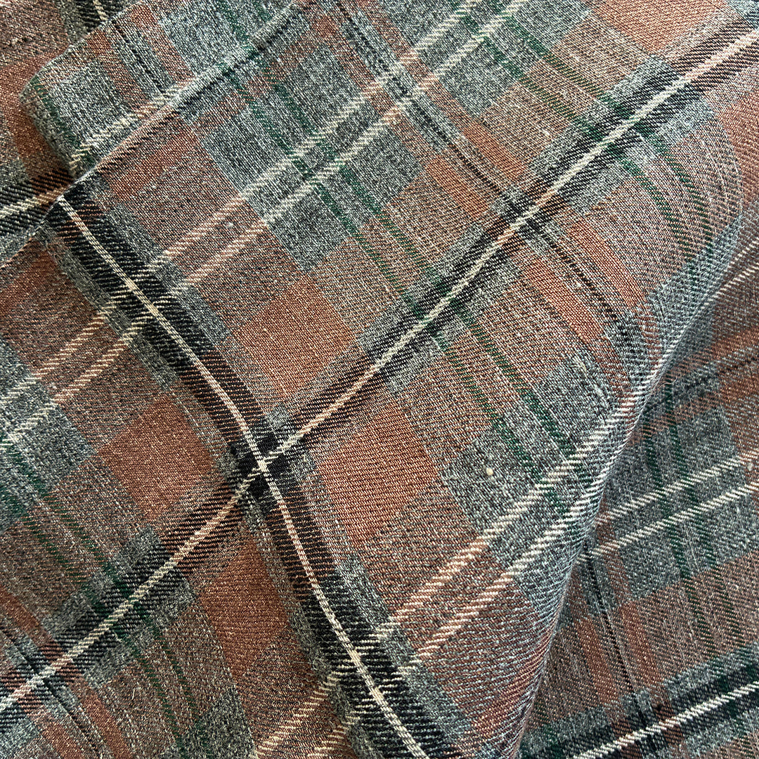 チャコールグレーに、ブラウン・ブラック・グリーン・ホワイトの重なりが映える、控えめで深いカラーリングが魅力。いつもと異なるベッドルームづくりにいかがでしょう。