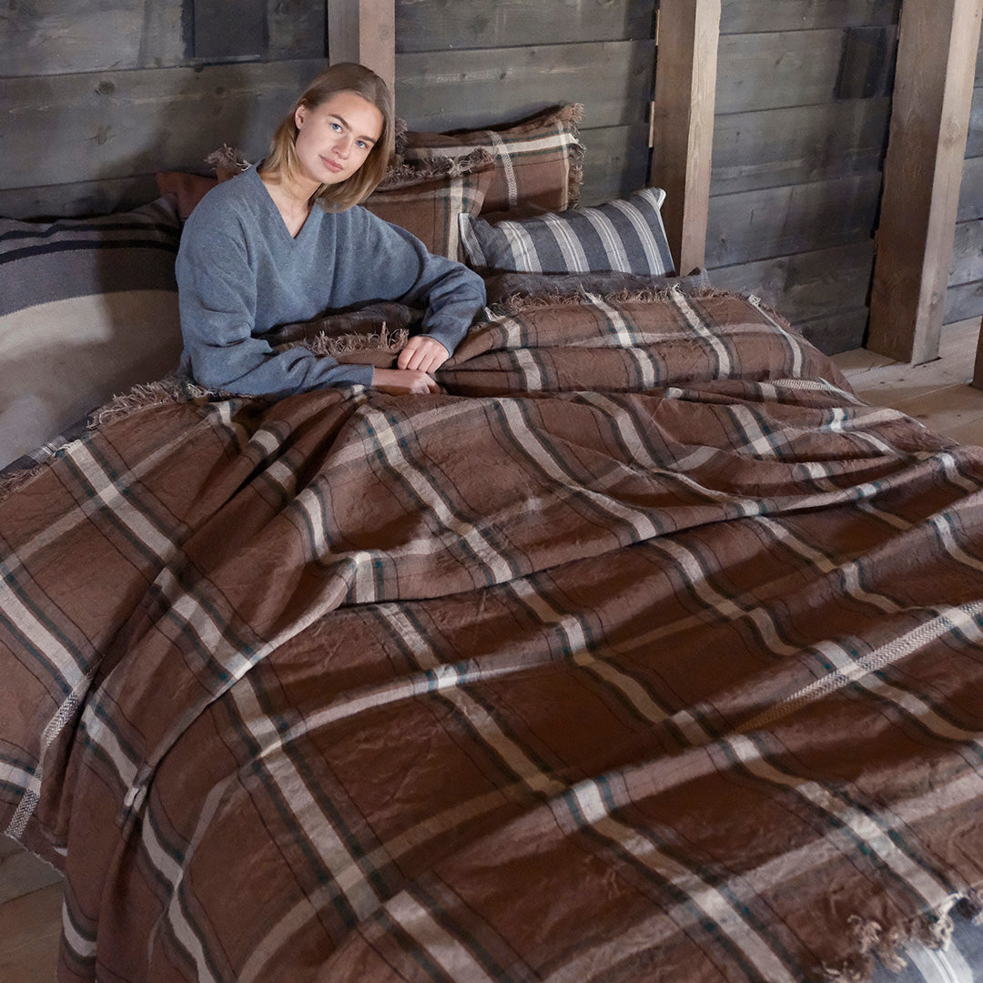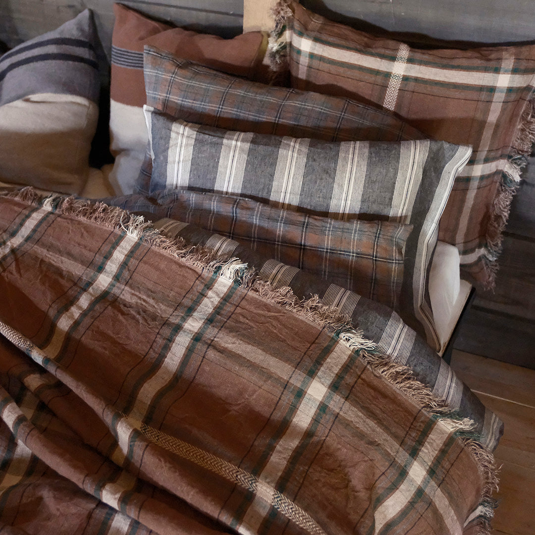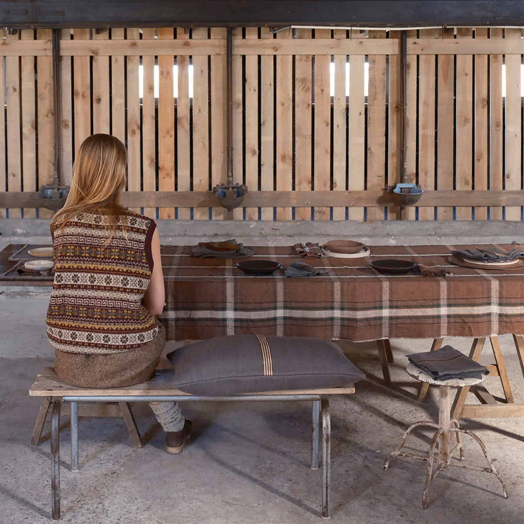 ローワンは当初生地として開発されましたが、調整を重ねるうちにデザイナーがその魅力に惹かれ、ホームリネンコレクションとしても展開されました。「これは時を越えて愛され、きっと心に長く残るチェックになる」という想いが込められています。