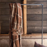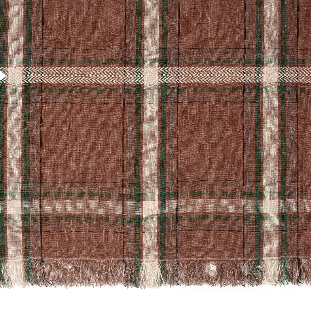 レーシンググリーン・チャコール・ブラック・オフホワイトのラインが、シエナブラウンに浮かぶオーソドックスなチェック織のリネンです。サイド(天地)にはヘリンボーン模様のストライプが施されています。