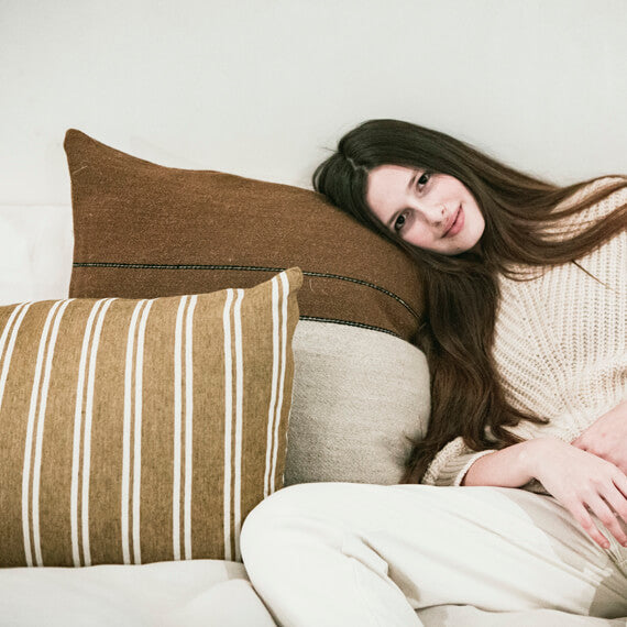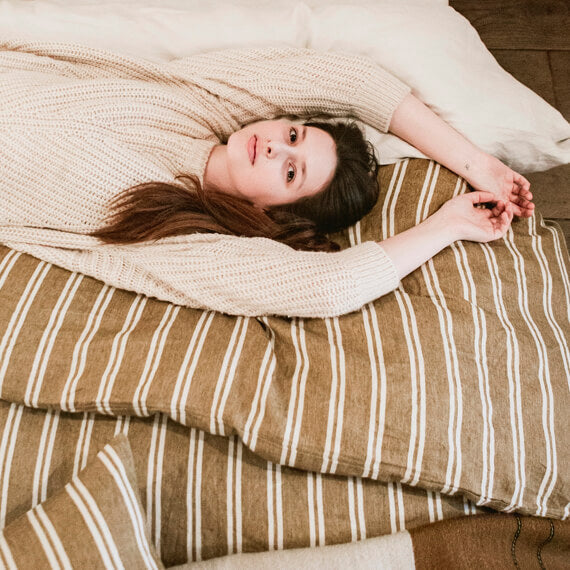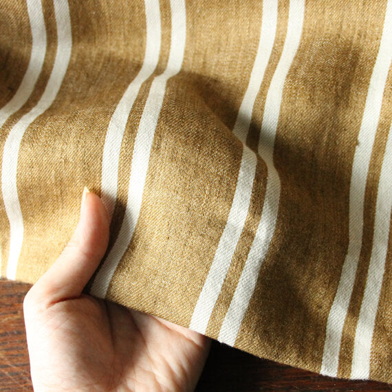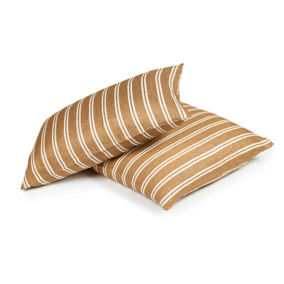 ナチュラルモダンなピローケース「カナル」。こっくりとしたブラウンベースにホワイトのダブルストライプが特徴です。ほどよい厚さの綾織生地に洗い加工をかけた柔らかな風合いです。