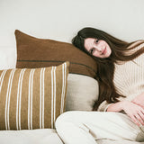 ナチュラルモダンなピローケース・カナルストライプ。こっくりとしたブラウンベースにホワイトのダブルストライプが特徴です。ほどよい厚さの綾織生地に洗い加工をかけた柔らかな風合いです。