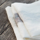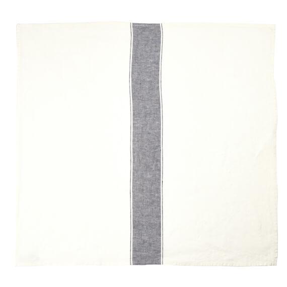 ホワイトにアッシュカラーのラインが入ったキッチンクロス・アジャクシオ。使うほどに柔らかくなるリネン100%のキッチンタオルは、拭いたり、掛けたり、敷いたり、包んだりと用途はさまざま。贈りものにも喜ばれますよ。