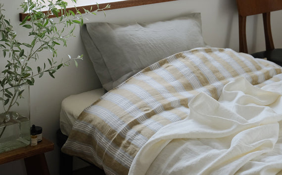 リネンは眠っている間の汗を吸収して放出し、蒸れずに繊維の中で温度を保つ力を持った天然素材。寒い時は布団に一枚重ねることであたたかく、暑い時は肌がけやシーツとして涼しく眠れて万能です。