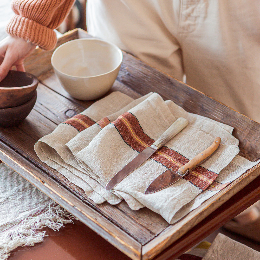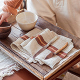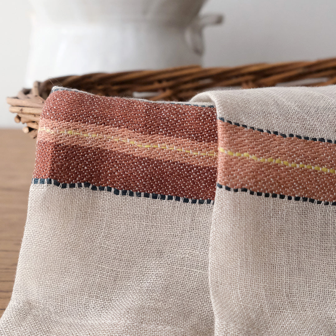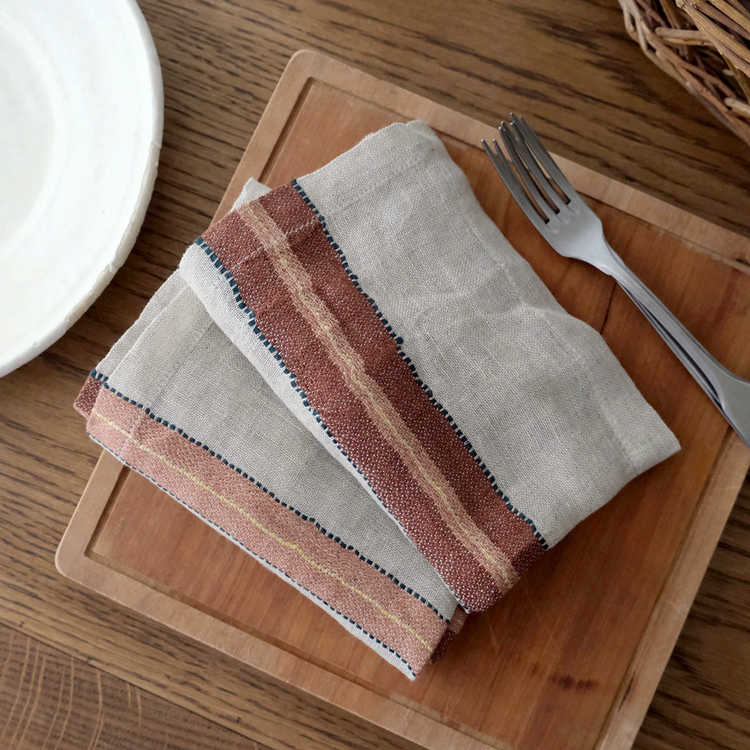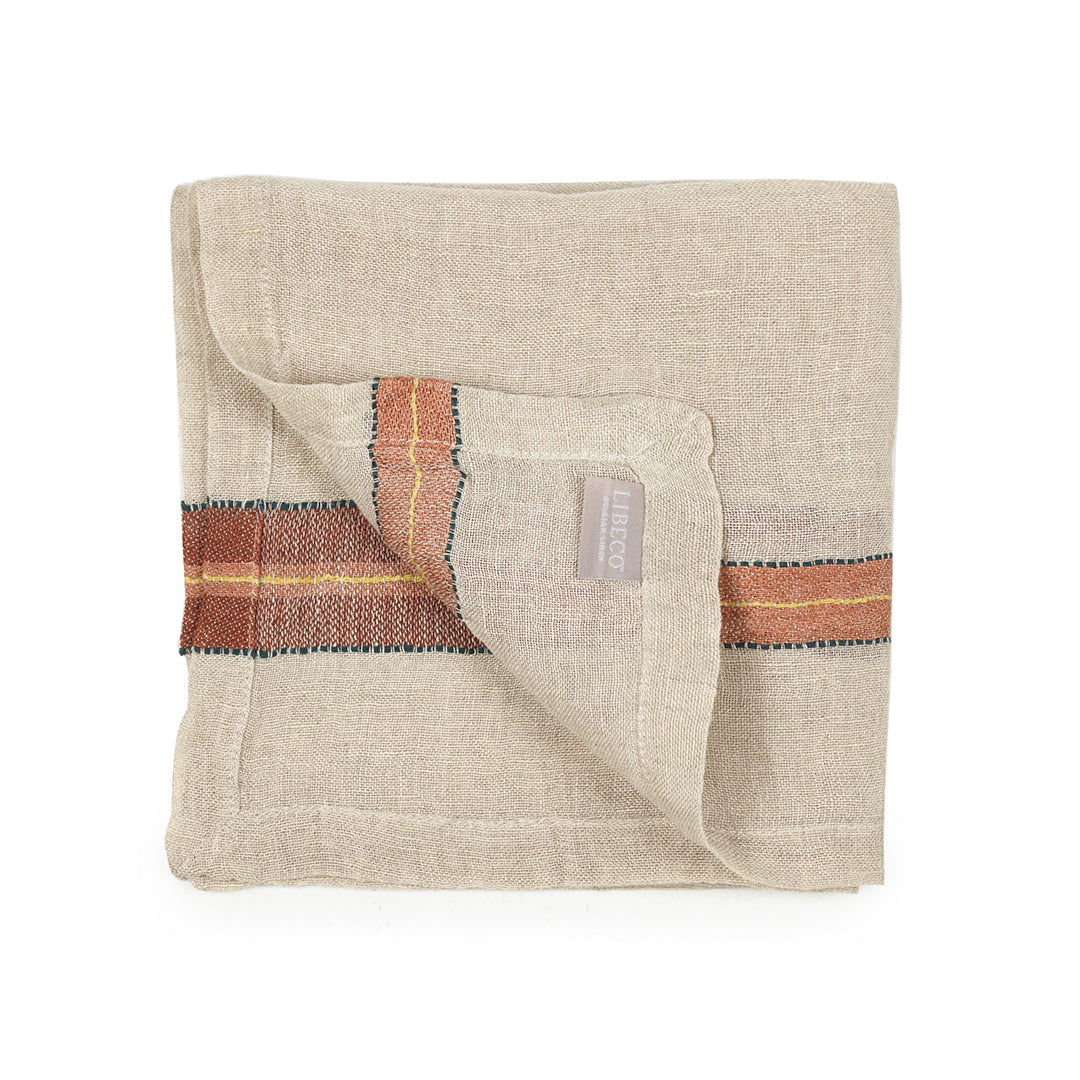 レザーブラウンにオレンジ、ノスタルジックなカラーリングが魅力のLIBECOのナプキン・バンクス。洗いのかかったガーゼ生地は、使いはじめからふわふわな風合いです。