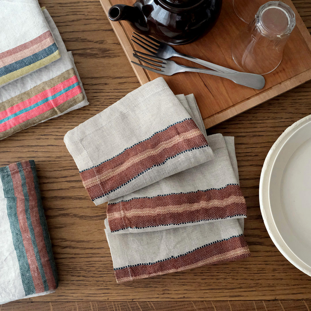 テーブルの上にラフにセットするだけで、華やかなテーブルコーディネートになります。キッチンクロス、プレースマットのほかハンカチとしてもおすすめです。