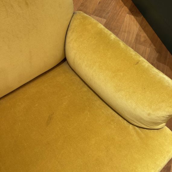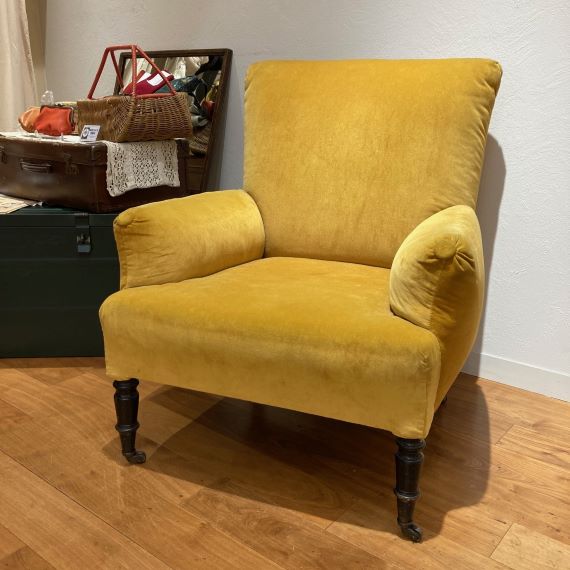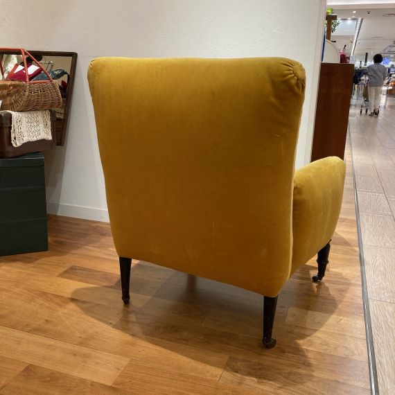 個性的なマスタードカラーの生地で張られたシングルソファ。お部屋のコーナーやお持ちのソファと合わせて。どこに置いてもアクセントになって空間を華やかにすること受け合いです。