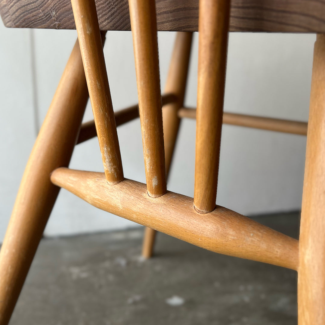 座面はニレ材、他の部材はブナ材を使用。スピンドルが後脚のつなぎに接合されたデザインが秀逸です。今回はディスプレイとしてのご紹介で、経年変化によるがたつきや割れのある現状のままでのお渡しです。