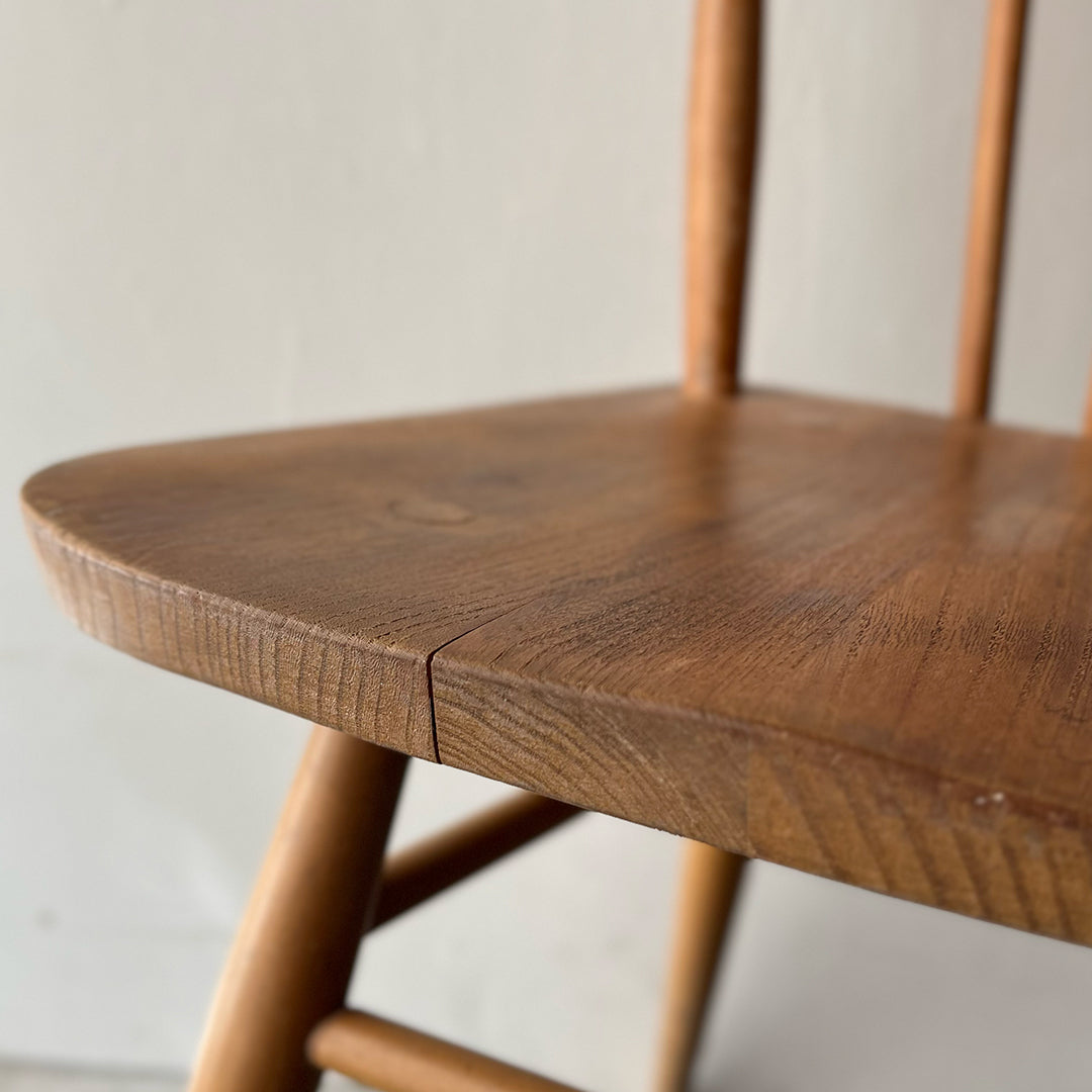 座面はニレ材、他の部材はブナ材を使用。スピンドルが後脚のつなぎに接合されたデザインが秀逸です。今回はディスプレイとしてのご紹介で、経年変化によるがたつきや割れのある現状のままでのお渡しです。