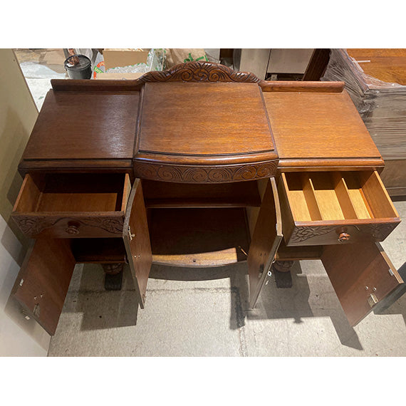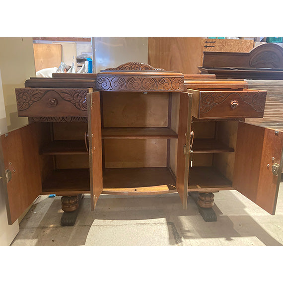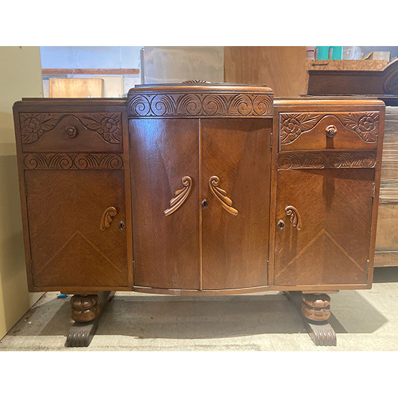 イギリスの1930~40年代のオークバッフェ。ダイニング用のサイドボードです。引き出しや取っ手に施された彫りが見事です。オーク材ならではの力強さを感じさせます。