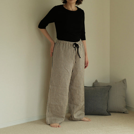 家での何げない時間もルンルンでいたい。そんなスリープパンツをめざして、ベルギーLIBECOの生地サン ガブリエルでつくりました。