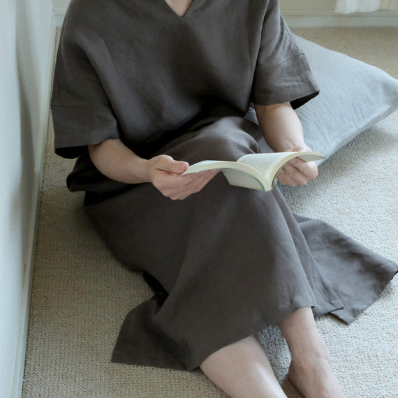 上質なベルギーリネンで仕立てたカフタンは、眠りのときも家でのひとときも、自分を労わる一枚になってくれますよ。