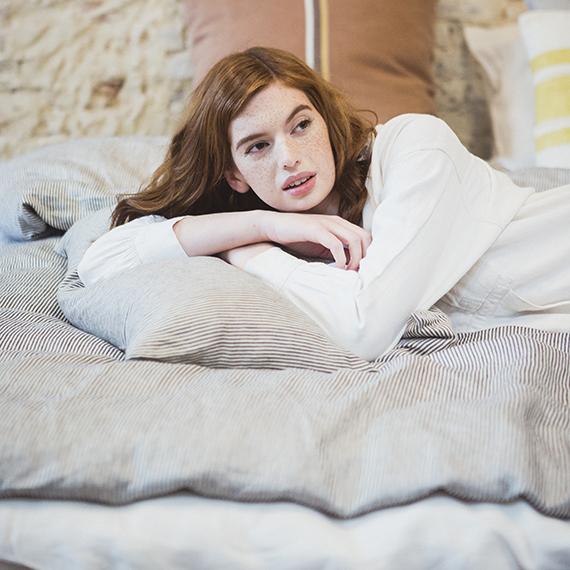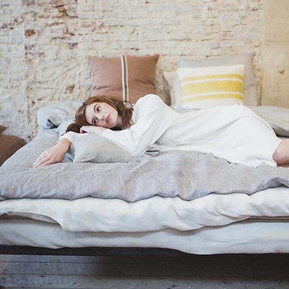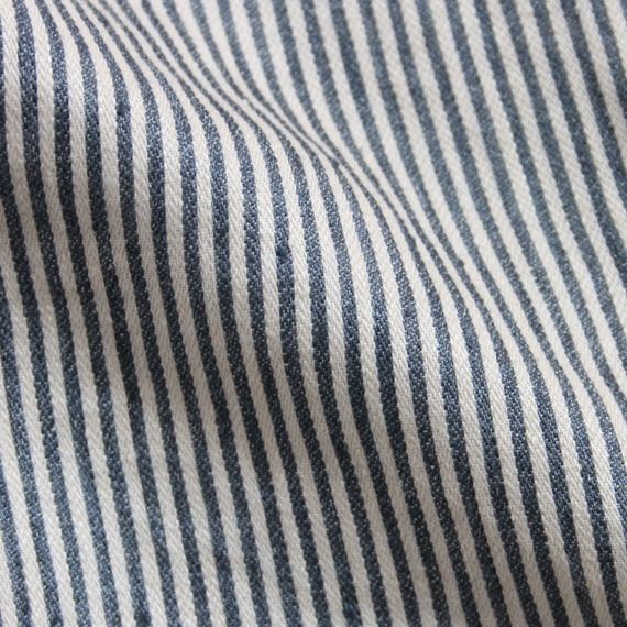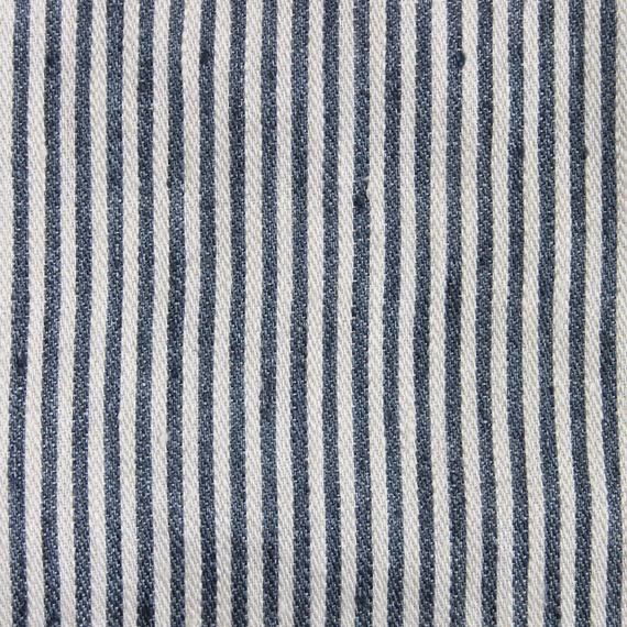 潔くクリアなイメージのデュベカバー「ワークショップ」。ネイビーとアイボリーが混ざり合い、霧がかった趣のあるピンストライプが特徴です。ほどよい厚さの綾織に、洗い加工をかけた柔らかな風合いの生地。デュベカバーの入れ口はビンの口のような形状をしたボトルネックで、マットレスに巻き込んだり、カバーの内側に折り込んで使用します。