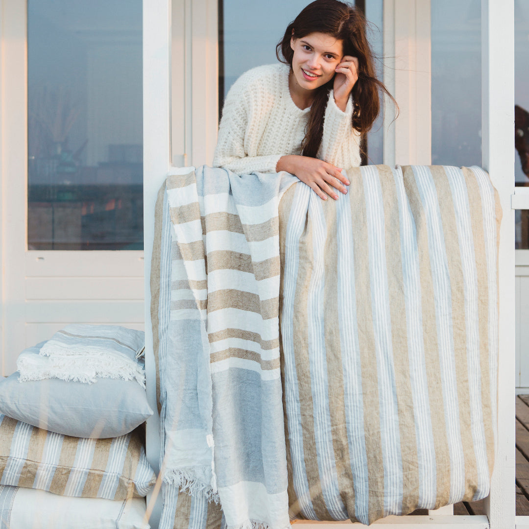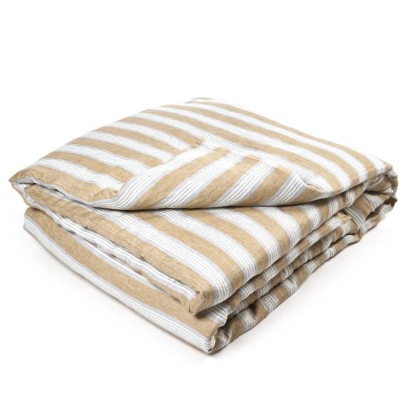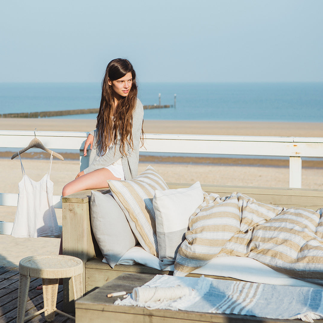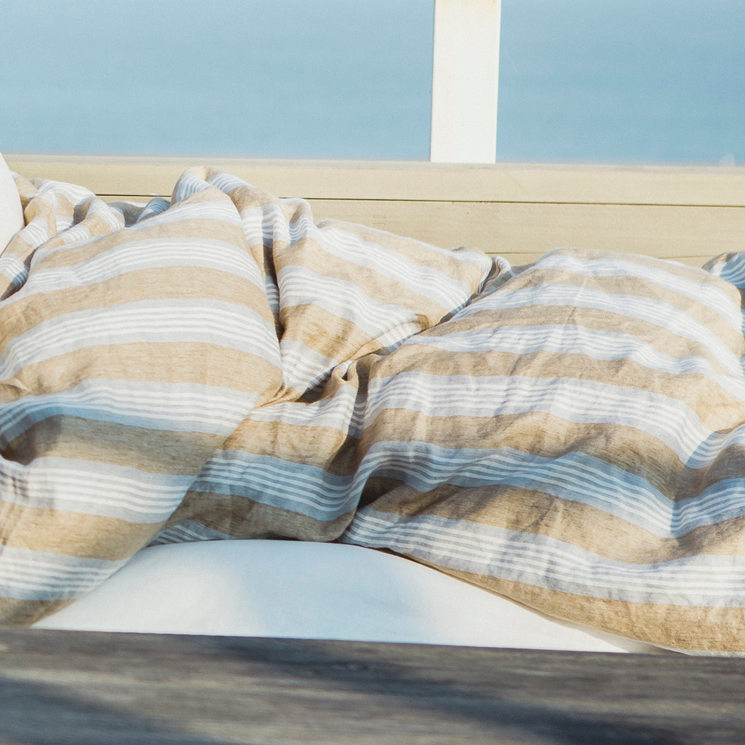 爽やかでノスタルジックなLIBECOのデュベカバー「マオラ」。ライトブラウンにグレーのピンストライプが淡く溶けみ、マニッシュな雰囲気を演出します。洗い加工された生地は、柔らかで気持ちのよい肌触り。デュベカバーの入れ口はビンの口のような形状をしたボトルネックで、マットレスに巻き込んだり、カバーの内側に折り込んで使用します。