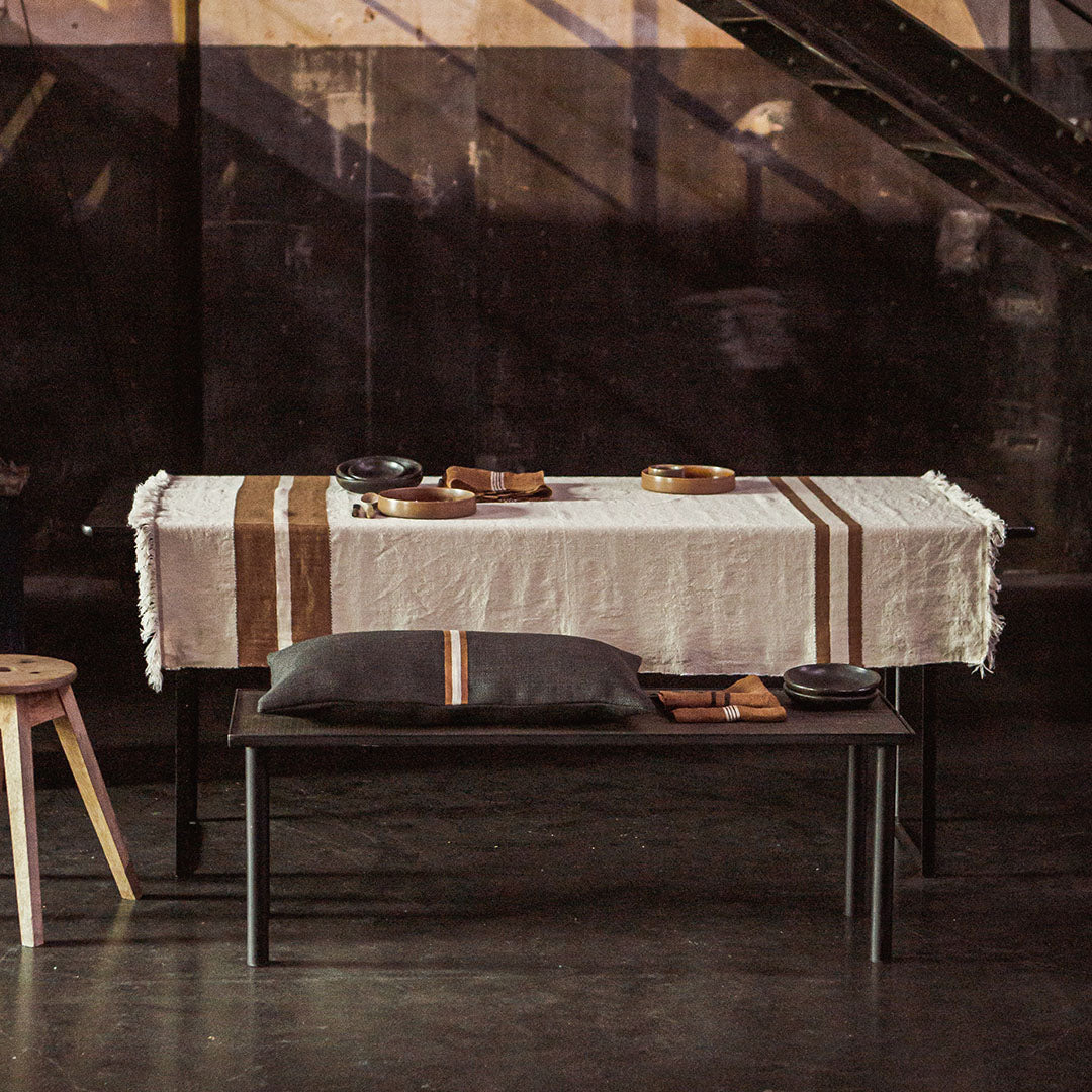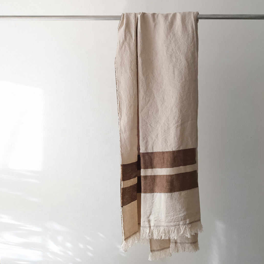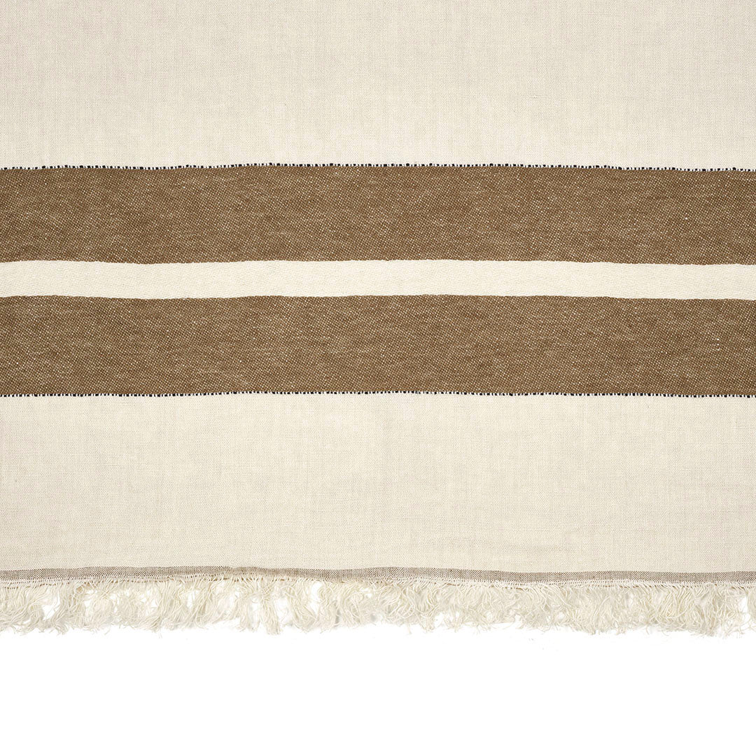 さらっとしたリネンの風合い豊かなLIBECOのスローベルジャン「レイルウェイ」。織で施されたナチュラルなブラウンカラーのストライプ柄が特徴です。流行に左右されずに使える一枚です。