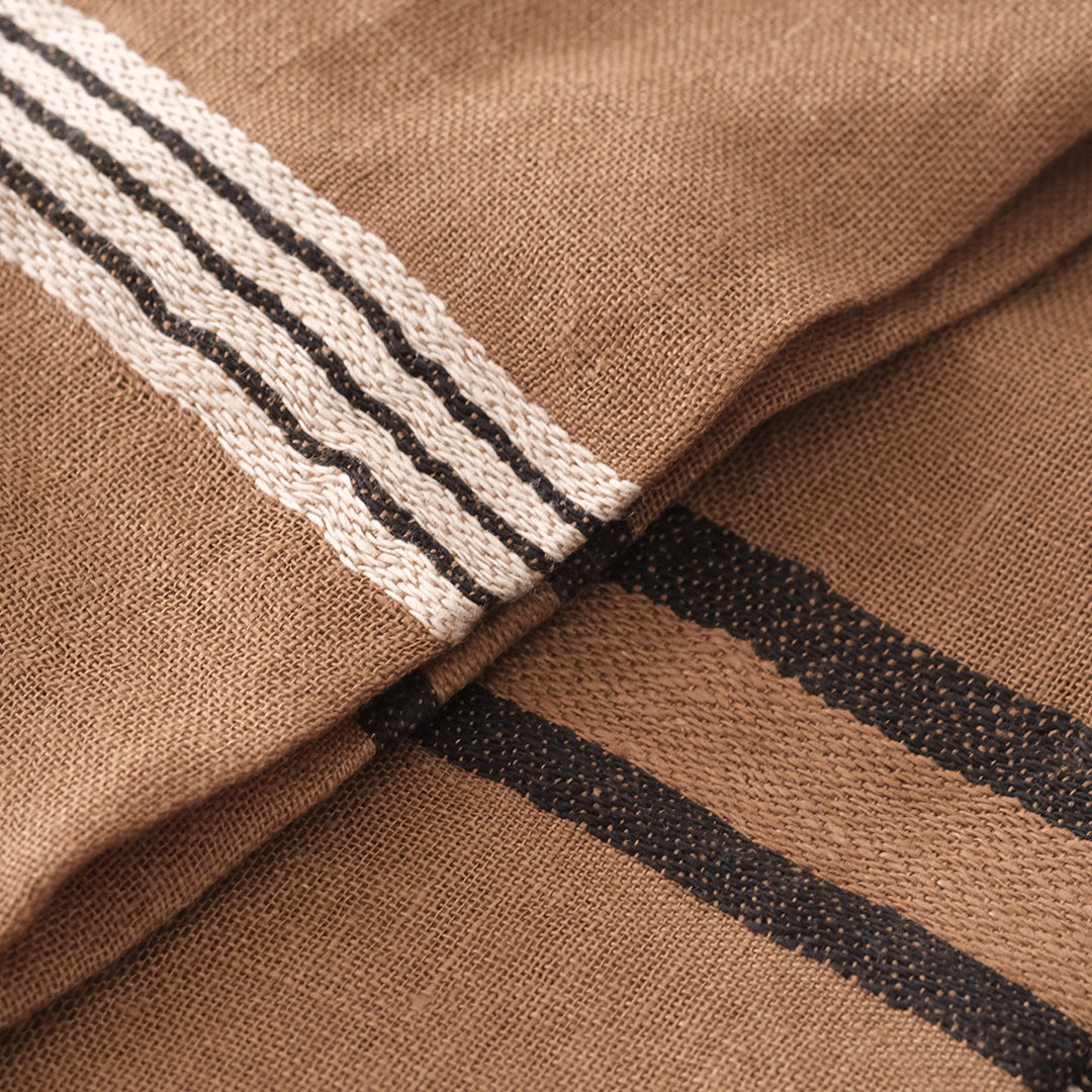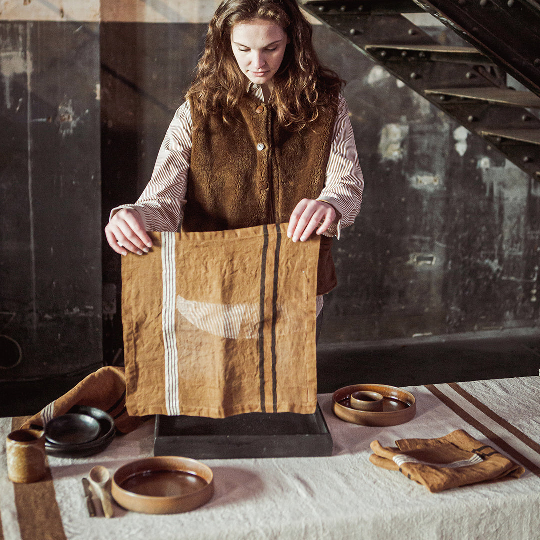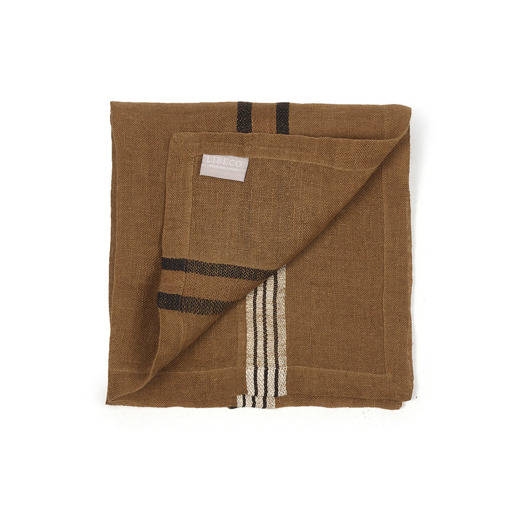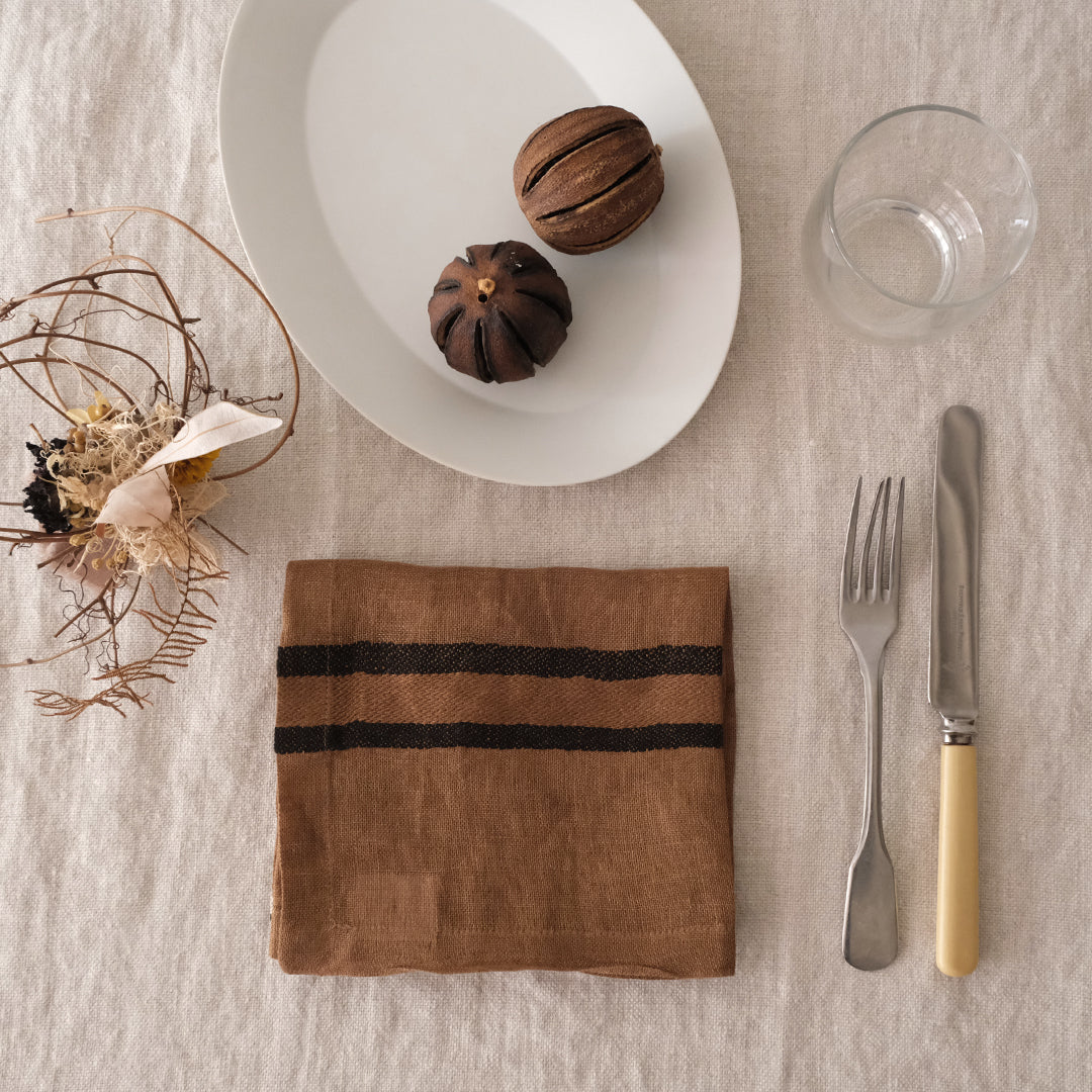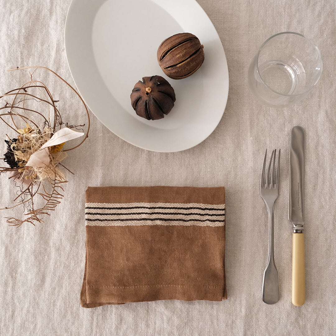 こっくりとしたキャメルブラウンに、オイスターとブラックのラインがモダンなLIBECOのナプキンロコモティブ。スタンダードなハドソンシリーズのテーブルリネンとのコーディネートがおすすめです。