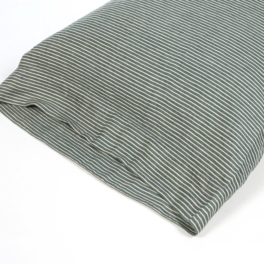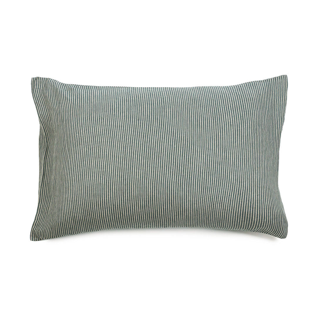 LIBECOのピローケース「セーラーズ」。エーゲ海から色付けされた、深いブルーグリーンのストライプが爽やかなベッドルームを演出します。見た目にも涼やかに眠れそうなインテリアを楽しんで。