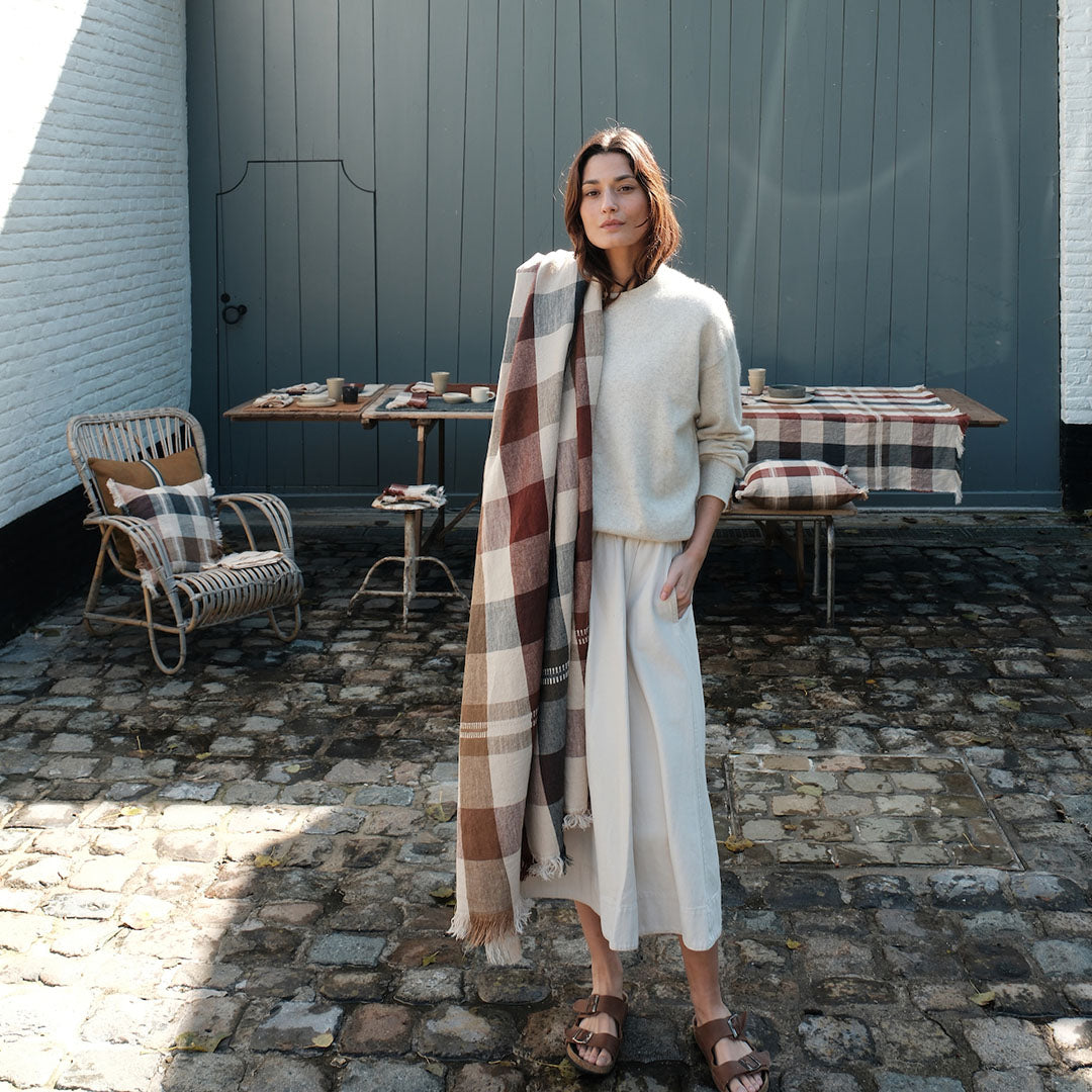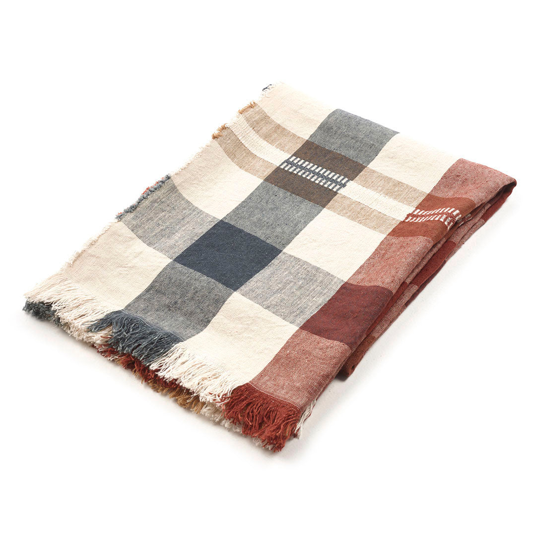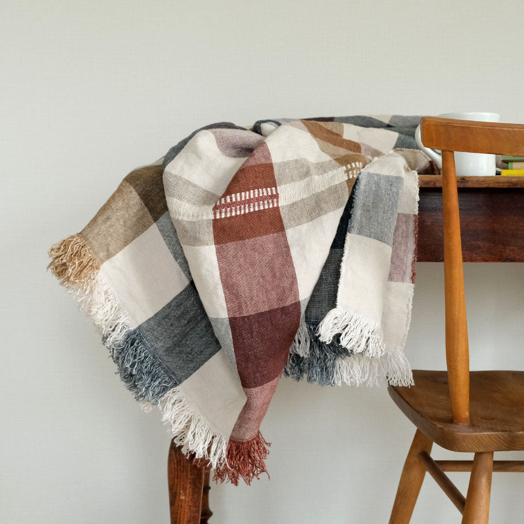 さらっとしたリネンの風合い豊かなLIBECOのスローベルジャン・マキシン。パッチワークするように、織とカラーでデザインされたチェック柄が魅力です。インテリアが新鮮に早変わりするシックかつ鮮やかな一枚です。